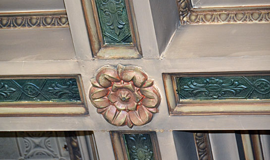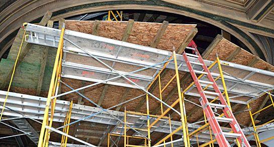 The Van Wert County Board of Commissioners and County Common Pleas Judge Charles D. Steele got a look at progress on the current courtroom renovation project Tuesday morning. Above, a network of scaffolding intersects the courtroom as work continues on the ceiling of the courtroom. Below is a close-up showing details of the courtroom’s original tin ceiling, which is being restored. (photos by Dave Mosier/Van Wert independent)