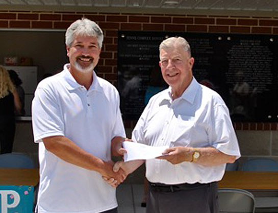 Larry Wendel, representing The Van Wert County Foundation, presents a check to John White, capital campaign chairman of the Van Wert County Tennis Association, in support of the new tennis complex that opened in early June. (photo submitted)