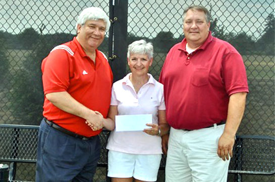 Marty Burchfield (left) and Dale Butler (right) present Rosie Cox of the Van Wert County Tennis Association with a check from the Van Wert Cougar Athletic Booster Club in support of the new Van Wert County Foundation Tennis Complex. The complex is open to the public as posted at the courts. (photo submitted)