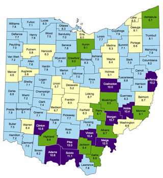 Other counties with unemployment at or below 6 percent included Holmes (5.1), Delaware (5.2), Union (5.7), Auglaize and Putnam (5.8), and Erie (6.0). Counties will a jobless rate at or above 10 percent included Meigs (12.0), Scioto (11.1), Morgan (10.7), Adams (10.6), Clinton (10.5), Noble and Vinton (10.4), Jefferson (10.2) and Coshocton (10.0).