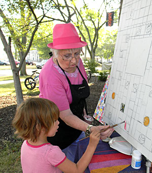 One at a time, the artists then chose a square on the canvas to paint while Geething offered suggestions, while working outside on the Library’s lawn for several days. In addition, the artist worked with registered Summer Reading participants from the YWCA and Wee Care Learning Center.