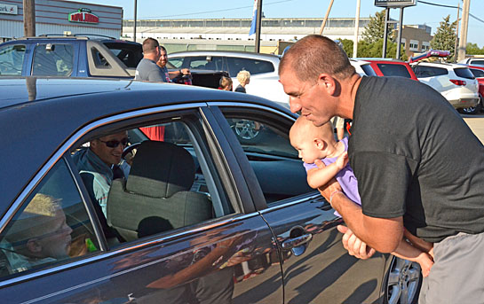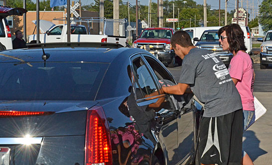 Van Wert Head Football Coach Keith Recker and the Cougar football team and cheerleaders were on hand Thursday at Lee Kinstle’s GM Sales & Service to distribute t-shirts made by Northwest Ohio Screenprinting to Youth Football players and cheerleaders. Above, Coach Recker holds his daughter while he talks to a Youth Football player. Below, a football player hands out a t-shirt on the Kinstle lot. (photos by Dave Mosier/Van Wert independent)
