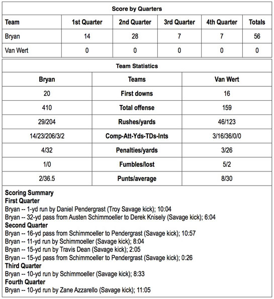 The Golden Bears scored less than two minutes into the game when Pendergrast scored from the Van Wert 1-yard-line at the 10:04 mark. Troy Savage hit the first of eight extra-point attempts and it was 7-0, Bryan.