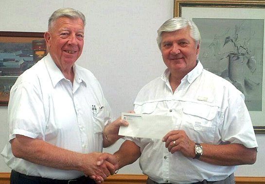 Larry Wendel, executive secretary of The Van Wert County Foundation, presents Jerry Mazur, organizer of the Hot Air Festival, with a sponsorship donation for musical entertainment at this year’s Hot Air Festival. The donation will provide a free musical concert by Todd Allen Herendeen, who will sing his hit song “My Name Is America”. The show starts at 7 p.m. this Friday at the Van Wert County Fairgrounds. Herendeen’s intermission will include a special Balloon Glow by several of the balloons taking part in the festival. (photo submitted)