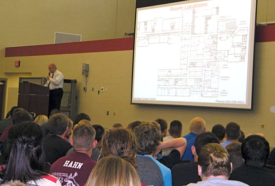 Vantage Career Center Director Bob Vennekotter (standing at podium) meets with the student body and uses a map to help students get acquainted with the school’s new floor plan. Because of fog on Wednesday, Thursday was Vantage’s first official day of school for the new year.(Vantage photo)