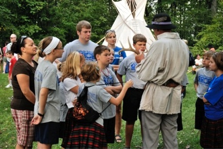 The Jennings Creek Council Rendezvous opened on Friday, September 7, to provide an educational session for area schools. St Mary of the Assumption School grades 4, 5, and 6 took advantage of this opportunity to learn some pioneer history of the Ohio Valley. By class, they visited various reenactment camps of trappers and settlers who shared the skills and goods of the frontier and told about the bartering that made their lives endurable. The children learned about weapons, coppersmithing, weaving, games, trapping, and the fur trade, and making every form of necessity with tools and materials at hand. After all the demonstrations the students had a “frontier” lunch and experienced some weather before returning to schools.
