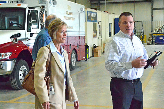 Ohio Department of Development Director Christiane Schmenk listens as Scott Braun provides information on local ambulance manufacturer Braun Industries. Schmenk toured a number of local sites on Thursday afternoon prior to speaking at the Van Wert Economic Development Annual Dinner at Willow Bend Country Club that evening. In the background is County Commissioner Clair Dudgeon. (Dave Mosier/Van Wert independent)