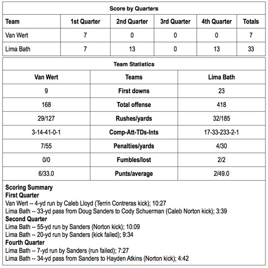 Neither team could score in the third quarter, but Bath added two more touchdowns in the final stanza. The first came on a 7-yard run by Sanders with 7:27 left in the game. A run for the point-after failed and it was 26-7, Wildcats. Sanders found Hayden Atkins for a 34-yard TD pass with 4:42 left in the game for the final score of the night. Norton kicked the point-after for the final 33-7 score.