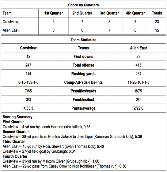 Allen East’s Stewart was the game’s top rusher with 119 yards on 26 carries (4.6 yards per carry average), while Tyler Friesner had 72 yards on 7 carries and Thomas ran for 60 yards on 11 carries for the Mustangs. Nate Owens led Crestview with 35 yards on 5 rushes. Zaleski completed 8 of 15 passes for 133 yards and a touchdown, while Crow was 11 of 25 for 161 yards, a touchdown and those five interceptions.