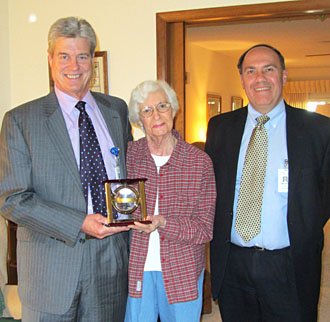 Van Wert County Hospital President/CEO Mark Minick presents a commemorative clock to Dottie Stahl, while Mike Holliday, hospital vice president of fiscal and administrative services, looks on. (VWCH photo)