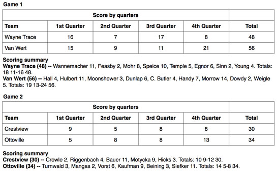 The Big Green were led by Abby Siefker’s 11 points, while Tonya Kaufman added 9 points for Ottoville. Top scorer for the Lady Knights was Emily Bauer, also with 11 points, while Lindsey Motycka had 9 points for Crestview.