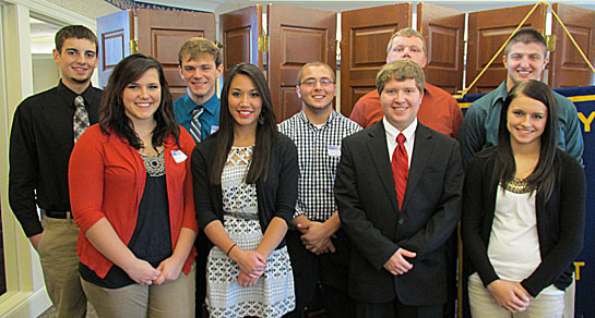 The 63 high school seniors who attend the weekly meetings of the Van Wert Rotary as Student Rotarians are eligible to apply for one of five $3,000 scholarships granted each year by the club. The scholarships, which began in 1963, amount to $750 a year for four years. One scholarship is awarded to Crestview, Lincolnview and Vantage, and two are awarded to Van Wert. November Student Rotarians who are eligible to apply for a scholarship are (front row, from the left) Sydney Collins of Van Wert, Rachel Chen of Van Wert, Zach Taylor of Crestview, Whitney Miller of Lincolnview; (back row) Brooks Ludwig of Van Wert, Scott Turner of Van Wert, Jake Harmon of Crestview, and Nick Dealey and Isaac Young, both of Vantage Career Center. (Van Wert Rotary photo)