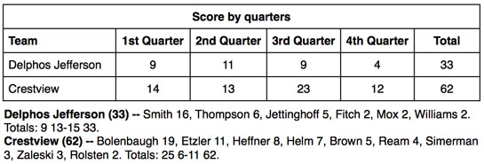 CONVOY — The Crestview Knights jumped out to a big lead and then cruised to a 62-33 Northwest Conference victory over Delphos Jefferson on Friday night.