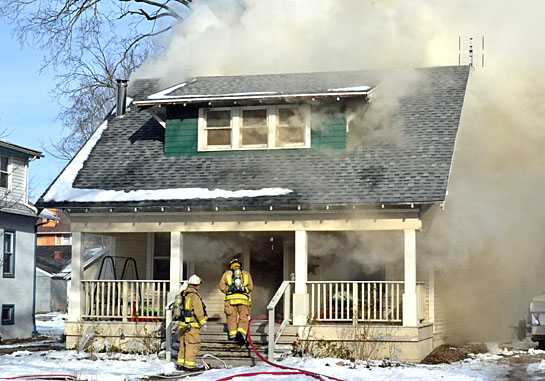 A house at 115 E. Second St. was heavily damaged by a fire that occurred Tuesday morning. Firefighters were called out at approximately 11 a.m. Tuesday to battle the fire in the two-story structure. No one was at home at the time of the fire, which brought firefighters out a second time later on Tuesday when the blaze rekindled. No information has been released on the cause of the fire or the extent of damage to the house. (Dave Mosier/Van Wert independent)