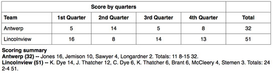 Lincolnview shot 50 percent from the field (24 of 48) and also made half of its free throws (2 of 4). Antwerp was 11 of 28 from the field (39.3 percent) and was 8 of 15 at the line (53.3 percent).