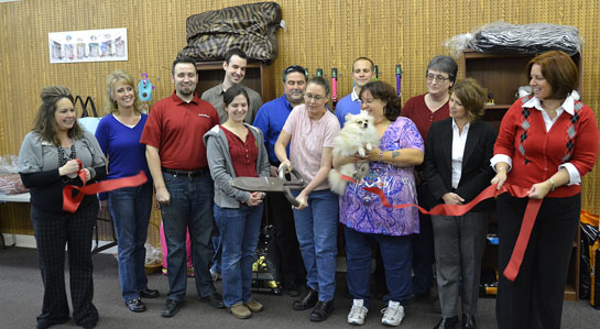 Dog House Grooming was officially opened Friday with a ribboncutting ceremony by the Van Wert Area Chamber of Commerce. Here, Dog House Grooming owner Lora Stienecker cuts the ribbon on the shop, located at 117 N. Washington St. The business offers holistic pet foods and provides a number of grooming services for all types of pets, including birds. Hours for the shop are 8:30 a.m.-5 p.m. Monday through Friday and 9 a.m.-2:30 p.m. on Saturdays. The shop will offer a number of daily specials, which will all be its Facebook page (Dog House Grooming/Van Wert). Stienecker and her staff has more than 40 years of experience in the pet grooming business. (Dave Mosier/Van Wert independent)
