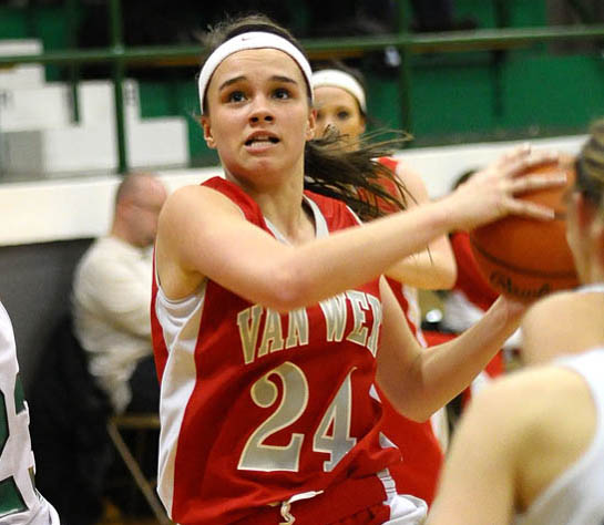 Van Wert’s Erin Morrow (24) tries to drive the lane against Celina defenders during a Western Buckeye League contest won by the Lady Bulldogs 63-41 on Thursday. (Jan Dunlap/Van Wert independent)