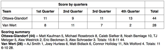 The Titans led 11-8 in the first quarter, but Van Wert outscored the Titans 11-9 in the second period to trail by just a point, 20-19, at the half. The Cougars were down by just five points, 31-26, with a quarter left to play when the bottom fell out, allowing O-G to go on a 13-2 run to put the game on ice.