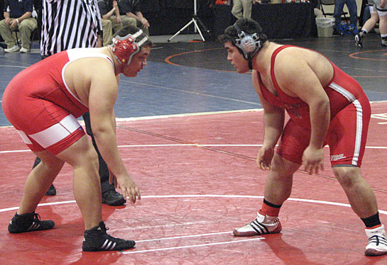 Van Wert wrestler Terrin Contreras (above right) ended with a 2-2 record, both pins, in the Division II district tournament on Saturday, good enough for fifth place and a possible berth as an alternate at the state wrestling tournament. Contreras wrestled in the 285-pound weight class. The only other Cougar wrestler competing at districts was Colten Royer, who finished 1-2, with one pin, in the 160-pound weight class. (photo submitted)