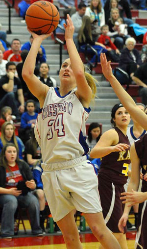 Riggenbach and freshman Emily Bauer led the Knights with 15 points apiece, while Terra Crowle added 10 points and Kennis Mercer had 8 points for Crestview. Kylie Osterhage led all scorers with 17 points, while Jackie Gardner added 10 points for Kalida.