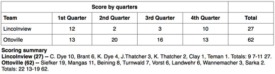 The Lancers started out good against Ottoville, trailing by just a point, 13-12, at the end of the first quarter. But the middle two quarters sounded the death knell for Lincolnview, which was outscored 36-5 in those quarters and trailed by a whopping 32 points, 49-17, by the start of the final stanza of play.