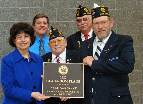 Members from the Isaac Van Wert American Legion Post 178 recently donated individual classrooms flags to the new Van Wert Elementary School. Van Wert Elementary Principals Beth Runnion and Kevin Gehres are shown accepting a plaque recognizing this donation. Also in the photo are (from the left) Post 178 Adjutant Les Brown, Past Commander Gary Fiegel and Post Commander Ken Schutz. On behalf of its students and staff, Van Wert Elementary School would like to express its appreciation for this donation, and is proud to partner with Legion Post 178. (VWCS photo)