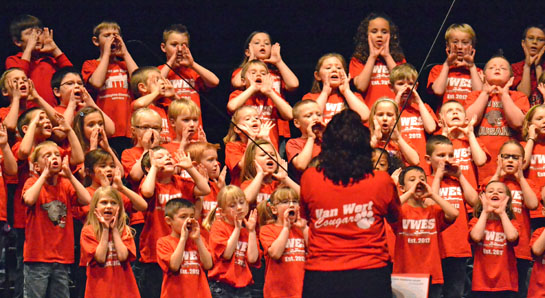 First- and third-graders at Van Wert Elementary School put on their spring programs Monday night on the stage of the Niswonger Performing Arts Center of Northwest Ohio. Here, first-graders shout out “John Jacob Jingleheimer Smith” as part of their “A Day in the Country” program. They also sang such favorites as “Old McDonald” and “She’ll Be Comin’ ‘Round the Mountain”. (Dave Mosier/Van Wert independent)