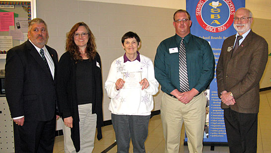 Crestview Local School District was acknowledged at the OSBA Northwest Ohio Spring Conference March 14, earning the first place Humanitarian Award for the district’s “Walk for the Dealeys” project. Nominated by Ottoville Local Board of Education member Kevin Landin, Crestview also assisted the OSBA in reaching its theme for 2012-13: Recognizing 26 acts of kindness in the Northwest Ohio Region. The project encompassed Crestview students organizing a walk-a thon to raise money for Mark and Sandra Dealey’s six children after an automobile accident took the life of their mother. While the original walk-a-thon took place in January, Crestview students are busy planning another walk-a-thon for the Dealeys this spring. In addition to the students’ efforts, Thrivent Financial for Lutherans matched a portion of the proceeds raised by the Crestview student body. Shown are (from the left) Eric Germann, NW Ohio School Boards Association president; Pam Brown, Senior Class advisor; Judy Wortman, Crestview Student Council Advisor; Keith Rydell, Crestview public relations director; and an unidentified NW OSBA representative. (Crestview photo)
