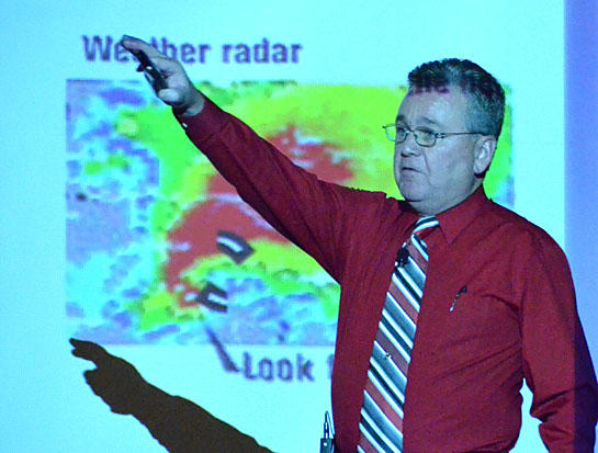 Van Wert County Emergency Management Director Rick McCoy (above) held a training session Wednesday evening in the Marsh Foundation Auditorium for a large number of volunteers wanting to be severe weather spotters. McCoy provided information on several types of severe weather, including photos and what to look for with each type of severe weather. (Dave Mosier/Van Wert independent)