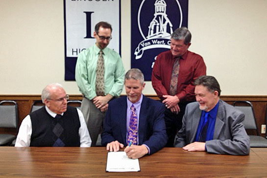 Local Pastors Keith Stoller (seated, left) and Paul Hamrick (seated, right) join Van Wert County Commissioners Thad Lichtensteiger (seated), Todd Wolfrum (standing left) and Stan Owens as the commissioners proclaim Thursday, May 2, as the “National Day of Prayer” in the county. The Van Wert Ministerial Association is planning a mid-day prayer service in front of the County Courthouse, starting at noon, and an evening service starting at 7 p.m. at Vantage Career Center in Van Wert. (photo submitted)
