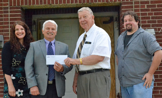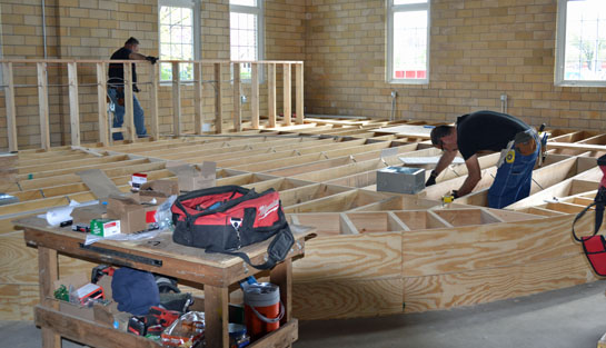 Wassenberg Art Center received a donation (above) from Van Wert Federal Savings Bank to cover the cost of refurbishing the metal front door of the former Van Wert Armory building. Larry McClure of Delphos will be doing the work, which is expected to take between four and six weeks. Shown are (from the left) Wassenberg Executive Director Hope Wallace, Gary Clay of Van Wert Federal, Van Wert County Foundation Executive Secretary Larry Wendel and Wassenberg Office Manager Matthew Temple. Below, workmen construct a stage in the main exhibit hall at the armory. Wallace said renovation work on the project should be completed somewhere around the first of August. (photos by Dave Mosier/Van Wert independent)