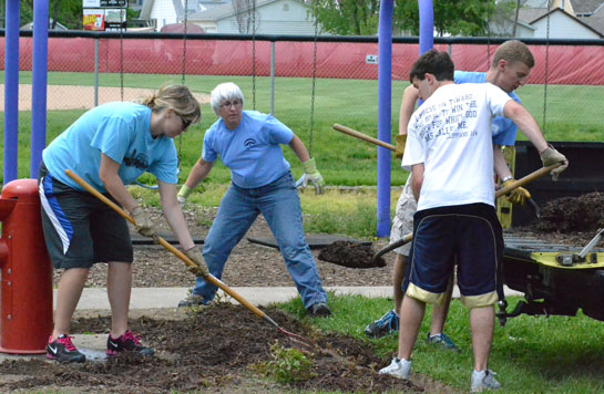 Niswonger Scholars (from the left) Ivory Shelton, Alex Smyth and Matthew Sheppard help Van Wert Parks Director Sue Heppeard with a project in Jubilee Park on Tuesday. A group of Niswonger Scholars are in town this week to get acquainted with Niswonger Foundation founders Scott and Nikki Niswonger’s hometown and provide some community service in exchange for their scholarship awards. (Dave Mosier/Van Wert independent)