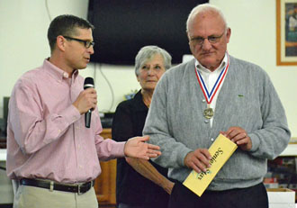 Van Wert County Council on Aging Executive Director Kevin Matthews (left) congratulates Larry Webb on being selected as one of 11 first-ever "senior stars" during Tuesday's Senior Citizens' Day Banquet at the Senior Center as Allie Kuhlman, Council on Aging Board president, looks on behind them. (Dave Mosier/Van Wert independent)