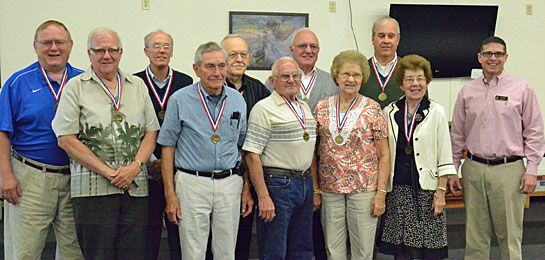 First-ever Van Wert County Council on Aging "senior stars", shown here with Council on Aging Executive Director Kevin Matthews (first row, right), include (front row, from the left) Bill Kuhlman, Mac Talton, Lloyd and Ilo Marvin, Jean Owens; (back row) Ken Mengerink, Gary Corcoran, John Marshall, Larry Webb and Ron Bagley. (Dave Mosier/Van Wert independent)