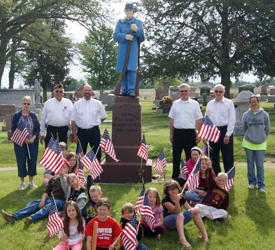 Several members of the Ohio City Blue Ribbon Workers 4-H Club partnered with area veterans to place flags on the graves of deceased veterans at Woodlawn Cemetery in Ohio City. Members met the veterans at the cemetery and all enjoyed spending the time together honoring deceased veterans in this way. (photo submitted)