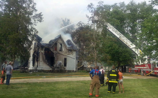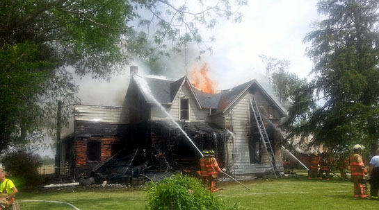 Seven area fire departments were on the scene to battle a Wren house fire that began sometime early Tuesday afternoon. The Van Wert County Sheriff’s Department received a 9-1-1 call at 1:39 p.m. Tuesday and dispatched the Wren Fire Department to the scene. Several other Van Wert County fire departments, including Willshire, Ohio City and Convoy, also provided mutual aid, as did Decatur and Preble, Ind. Brickner Ambulance Service also was on the scene and, according to a witness at the scene, several firefighters were treated for heat exhaustion and smoke inhalation, with one of those taken to the hospital. The Van Wert County Chapter of the American Red Cross was also on the scene, as was the Van Wert County Sheriff’s Department. (photos by Mark Klausing for the Van Wert independent)