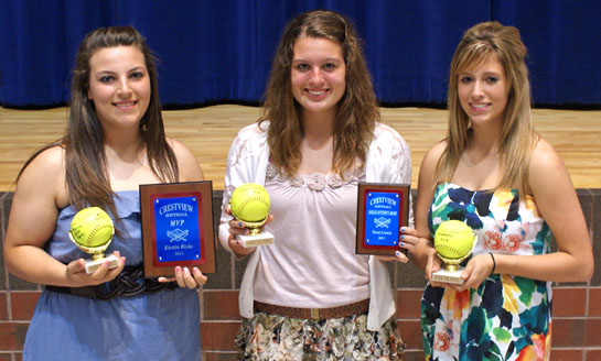 Members of the Crestview varsity softball team were acknowledged on May 28 at their annual awards banquet. Softball athletes, along with their parents, met in the Crestview auditeria for refreshments and a ceremony, during which softball players were recognized for their accomplishments and honors. For the 2013 season, the coaching staff selected a number of athletes for special awards. Special award winners include: Northwest Conference Team: Honorable Mention, Mackenzie Riggenbach; Second Team, Brooke Bowen; First Team, Terra Crowle and Kirstin Hicks. All District Team: Honorable Mention, Bowen; Second Team, Crowle; First Team, Hicks. All State Team: Second Team, Hicks. Over The Fence Award – Hicks, Riley Guest, Crowle, Brittany Helt; Knight Offensive Award – Crowle; MVP – Hicks; Pink Bat Award –Hicks. Shown are special award winners (from the left) Hicks, Crowle and Riggenbach. (Crestview photo)