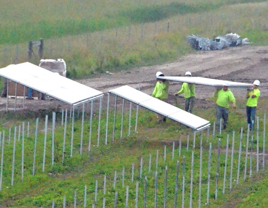 Workmen install a solar panel array north of Vantage Career Center on Friday morning. The array should be operational in August. (Dave Mosier/Van Wert independent)