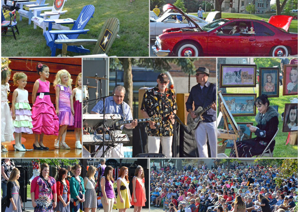Scenes from this year’s Peony Festival/ArtRageous on Main celebration include (top row, from the left) Wassenberg Art Center’s Chair-ity Auction and the Peony Fest Car Show on Main Street; (middle) Petal Princess Pageant in the S.F. Goedde Building gymnasium, Phil Dirt & the Dozers in Fountain Park and an artist displays her artwork in the park; (bottom row) Queen Jubilee XXXVIII Jordan Rex and her court and a portion of the huge crowd in Fountain Park on Friday evening. (photos by Dave Mosier/Van Wert independent)