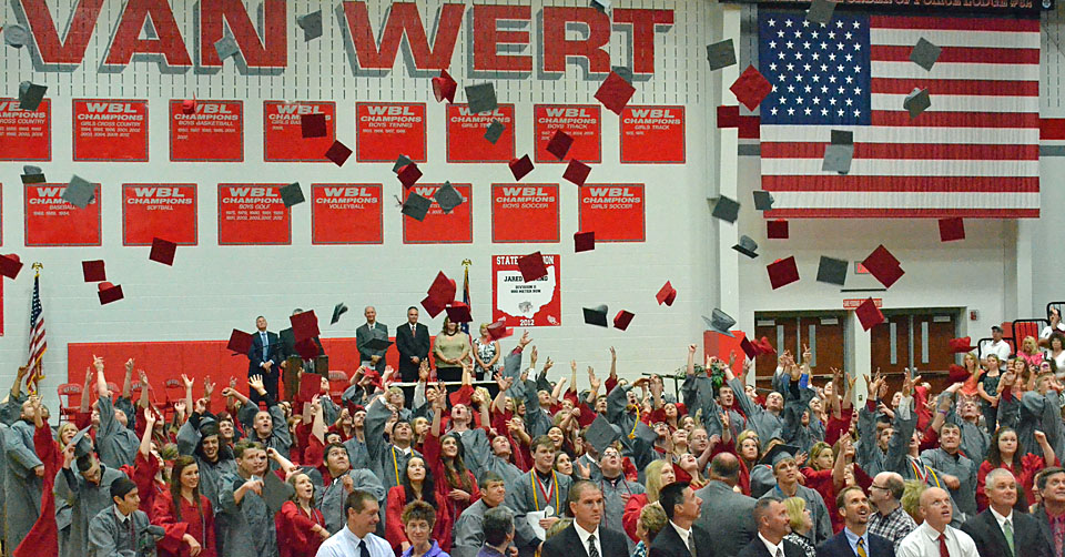 Both Van Wert and Crestview high schools held their graduation ceremonies over the weekend. Crestview was on Saturday evening, while VWHS held its graduation ceremonies on Sunday afternoon. Above, the VWHS Class of 2013 tosses its mortarboards at the end of the ceremony. (Dave Mosier/Van Wert independent)