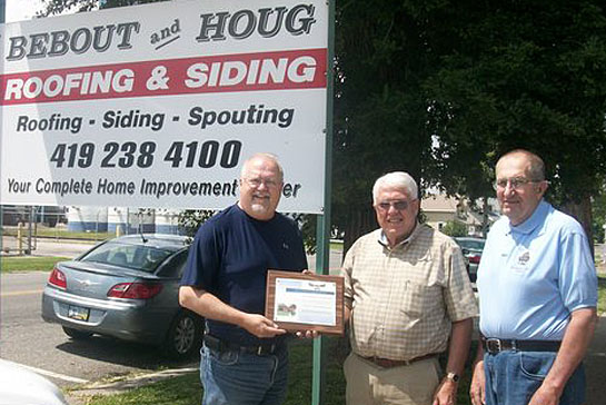 The Van Wert County Historical Society recently distributed awards for this year. Here, Gary Houg and Tom Bebout of Bebout and Houg Roofing and Siding receive the 2013 Isaac Van Wart Business Award of Appreciation from Van Wert County Historical Society Treasurer Ron Kessler. (Historical Society photo)