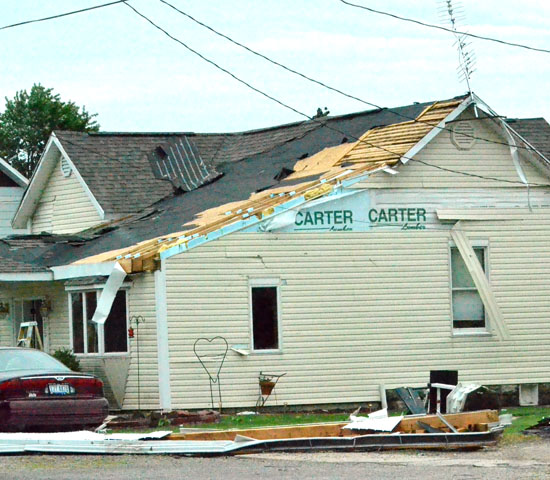 Damage consisted of heavy roof damage to several homes, all of the homes had shingles and/or siding ripped off, a number of the homes had windows busted out. A home at 205 Green St. also had the garage rolled off of its foundation. There were automobiles that had windows broken out and a car was crushed when a tree fell on it at a residence at 611 Ohio 49. McCoy said county storm losses would be several hundred thousand dollars.