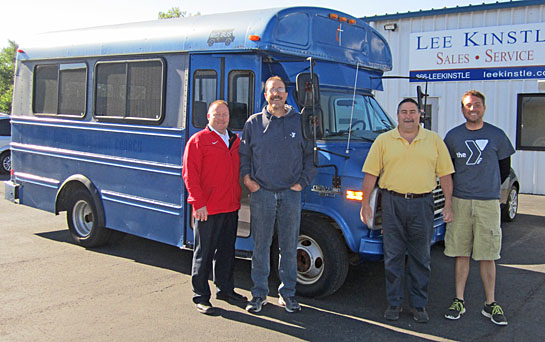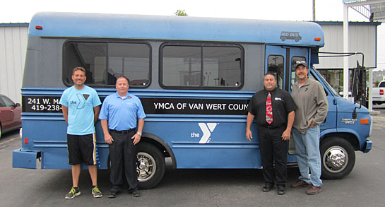 Eric McCracken and the staff of Lee Kinstle’s GM Sales and Service, along with Braun Industries, recently donated a 15-passenger bus to the YMCA of Van Wert County. The bus will be used for transporting children around the community and to take on field trips during the weekly-themed summer camps. The photos are “before” and “after” pictures of the donated bus. Shown in both photos are Eric McCracken of Lee Kinstle’s, YMCA Executive Director Hugh Kocab, YMCA Program Director Mitch Price and Troy Miller of Braun Industries. (YMCA photos)