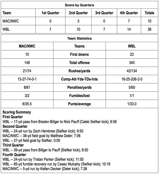 The WBL had the only score of the third quarter when Billger again found Pauff open for a 39-yard touchdown pass with 8:50 remaining in the quarter. Siefker again kicked the extra point for a 24-3 WBL lead.