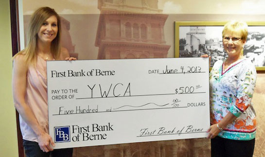 First Bank of Berne recently donated $500 to the YWCA to be used for their housing program. Shown are Sandy Waterman of First Bank of Berne presenting a check to Jamie Evans of the YWCA. (photo submitted)