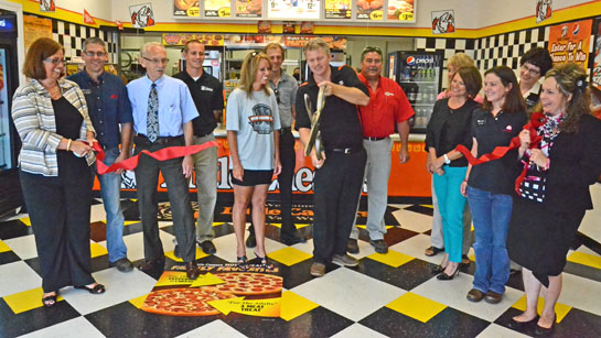 Little Caesar’s Pizza in Van Wert cut the ribbon on its Ervin Road store to recognize six months in operation at that location. Looking on are Van Wert Area Chamber of Commerce board members and Mayor Don Farmer. (Dave Mosier/Van Wert independent)