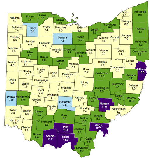 Six counties also had unemployment rates above 10.5 percent in June. Those included Meigs (12.7 percent), Pike (12.4 percent), Scioto (11.6 percent), Adams (11.2 percent), Morgan (11.0 percent), and Jefferson (10.6 percent).