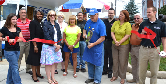 Van Wert Area Chamber of Commerce directors and staff helped Doug Bruns cut the ribbon Friday on his Dougie Dogs booth this summer during the Market on Main vendor market in downtown Van Wert. The booth is the result of a partnership between Bruns, the Ohio Rehabilitation Services Commission, Vicki Schulte of Market on Main and the Chamber of Commerce. Susan Millmine, vocational rehabilitation counselor with the ORSC, helped Bruns, a Delphos resident who lives in Van Wert County, purchase equipment for his booth, and also assisted him in becoming a Chamber member. The booth offers the highest quality hot dogs and brats, along with chips, drinks and more. (Dave Mosier/Van Wert independent)
