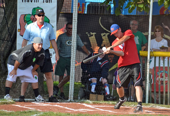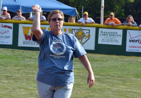 Wren resident Susan Huffman (above) throws out the first pitch to open this year’s Wiffleball Warehouse tournament in that village on Friday evening. First-round tournament action got underway soon afterwards as Yoder Trucking and Putman Stables (below) took to the field at Wrenway Park for the first tourney game. (photos by Dave Mosier/Van Wert independent)