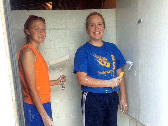 Delphos Pathfinders 4-H club members Colleen Schulte and Samantha Bonifas help paint restrooms at Babyland on the Van Wert Fairgrounds in preparation for the upcoming 157th edition of the Van Wert County Fair. (photo submitted)